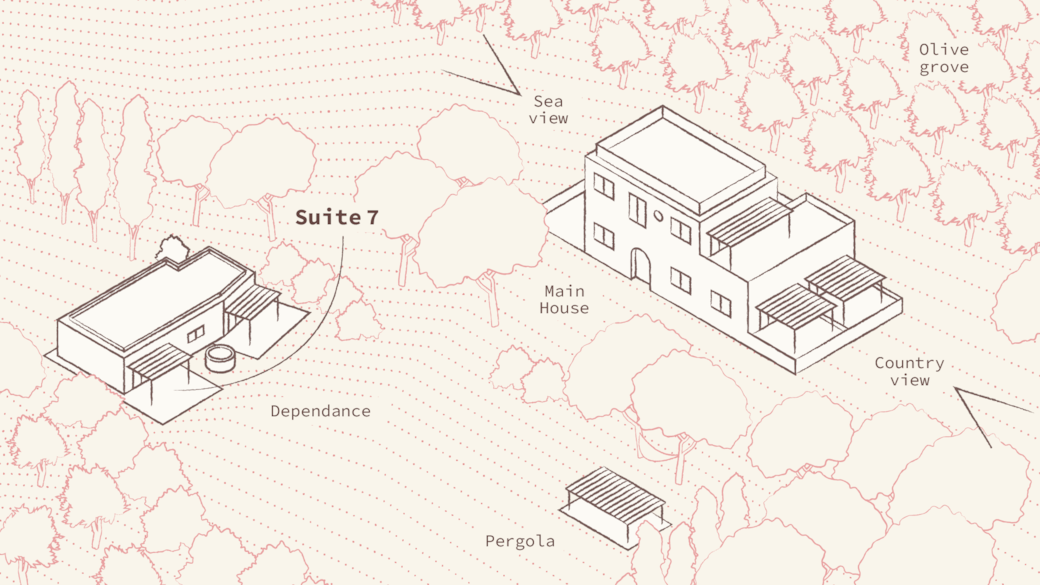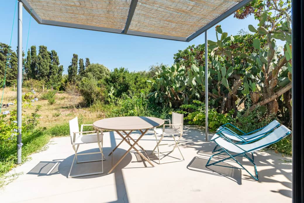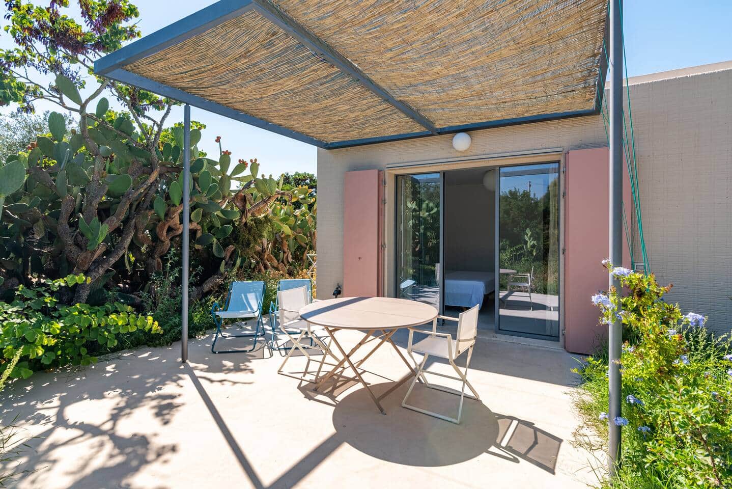 This particular room is located on the ground floor and features a spacious private veranda with a table and chairs, overlooking the garden and the olive trees.