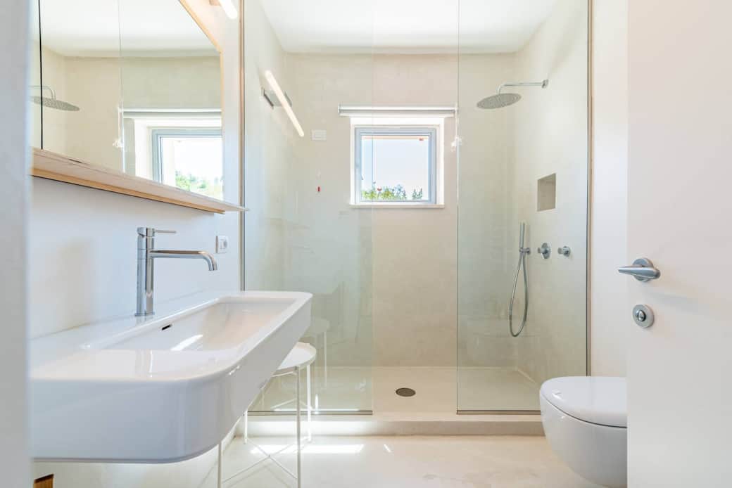 The bathroom includes a large walk-in shower with both rain and waterfall shower heads.