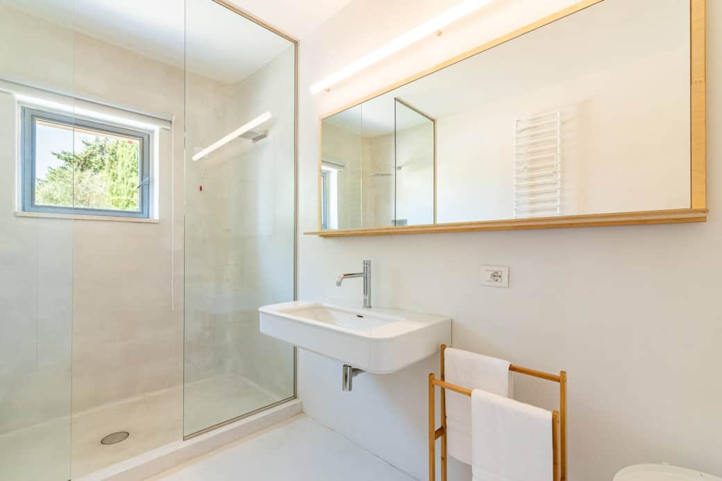 The bathroom includes a large walk-in shower with both rain and waterfall shower heads.