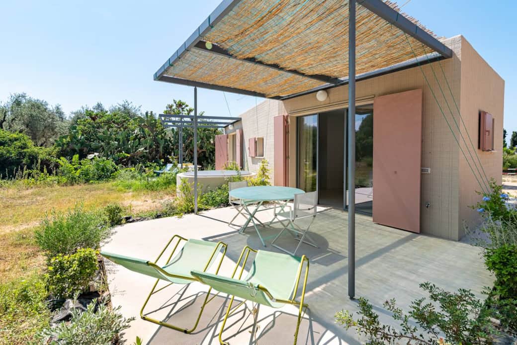 This particular room is located on the ground floor and features a spacious private veranda with a table and chairs, overlooking the garden and the olive trees.
