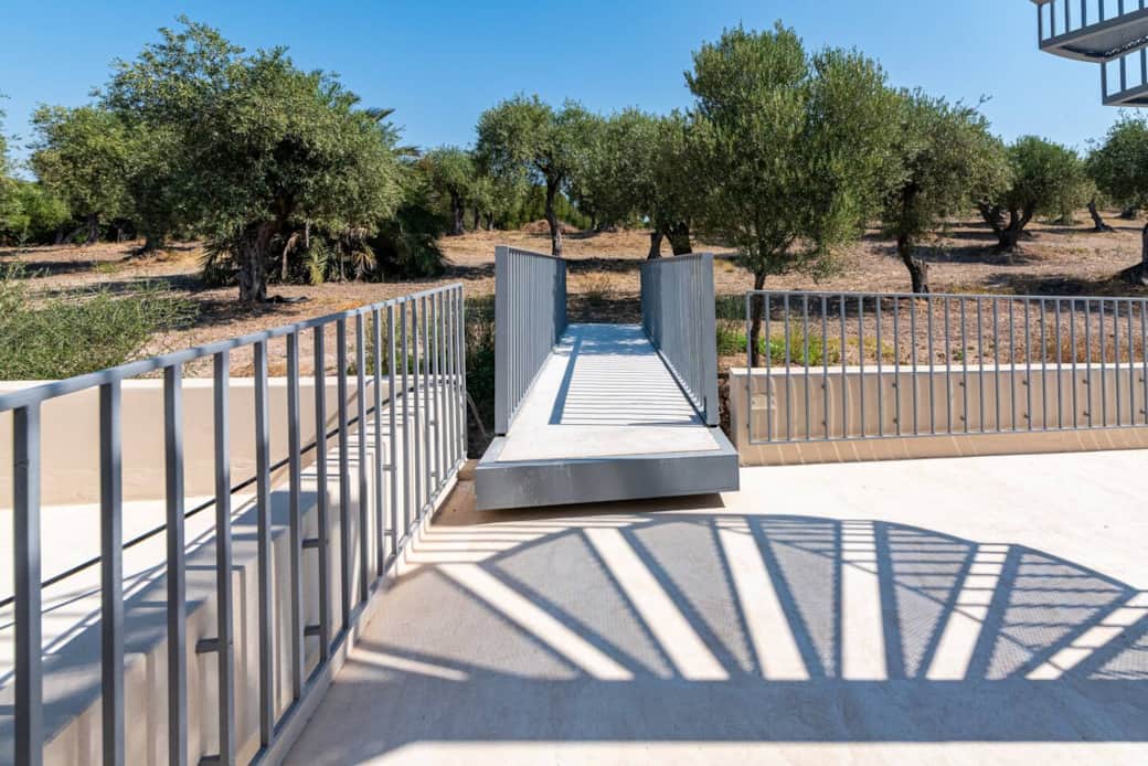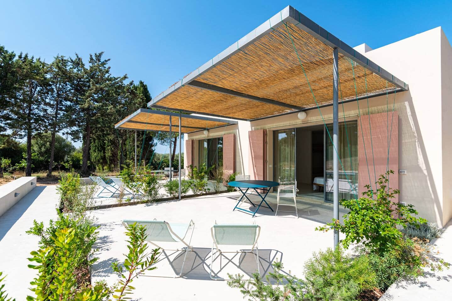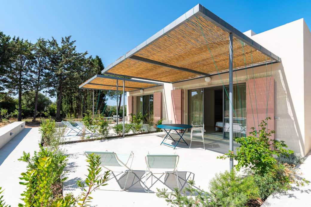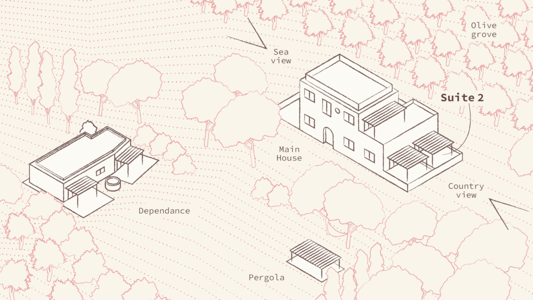 This particular room is located on the ground floor and features a spacious private veranda with a table and chairs, overlooking the garden and the olive trees.