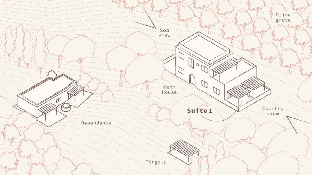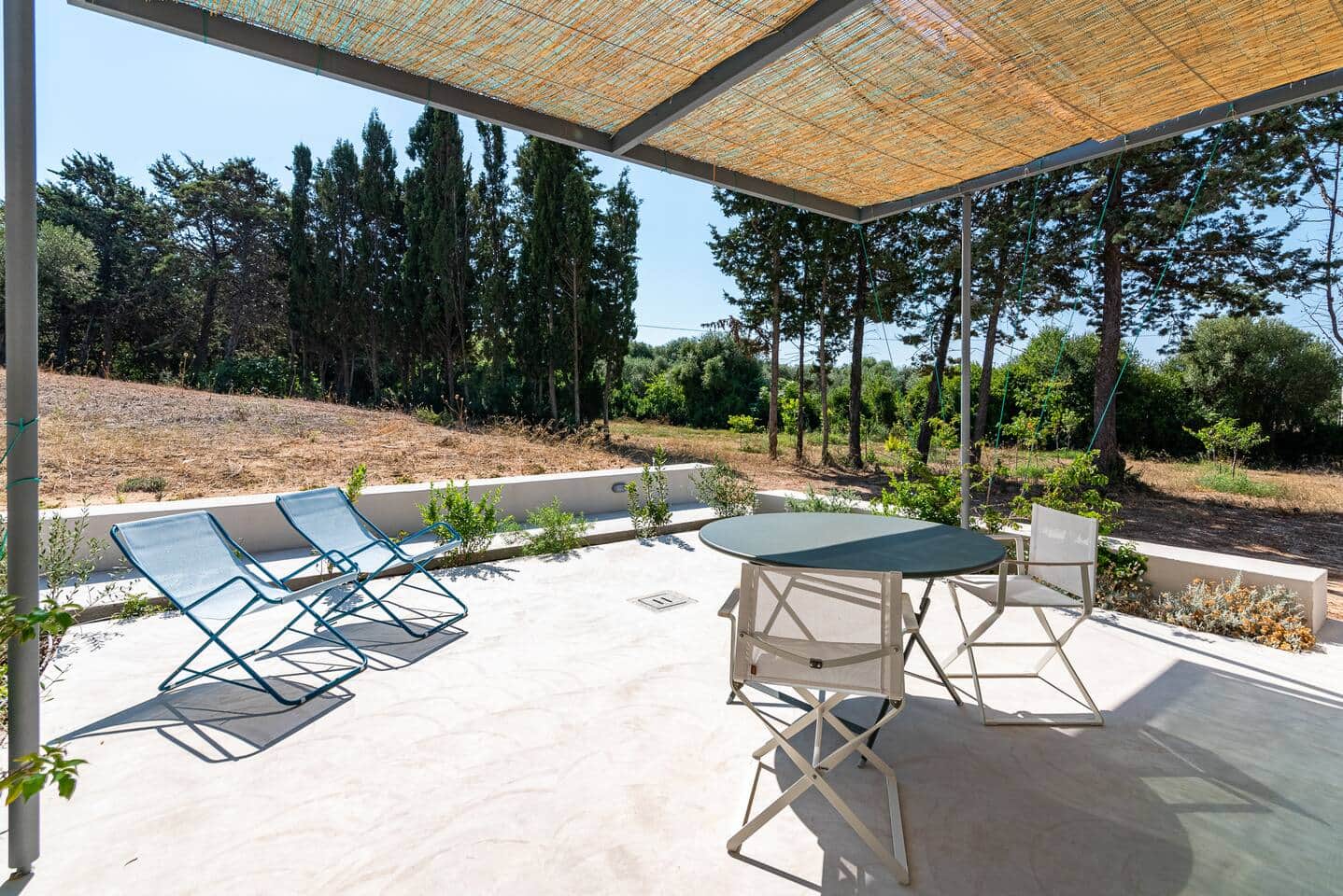 This particular room is located on the ground floor and features a spacious private veranda with a table and chairs, overlooking the garden and the olive trees.